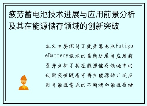疲劳蓄电池技术进展与应用前景分析及其在能源储存领域的创新突破
